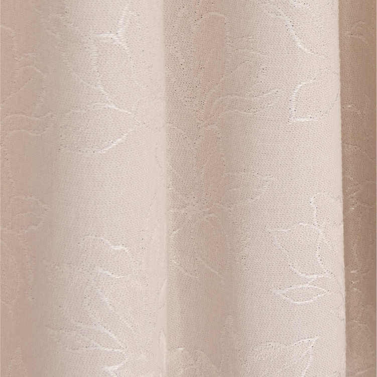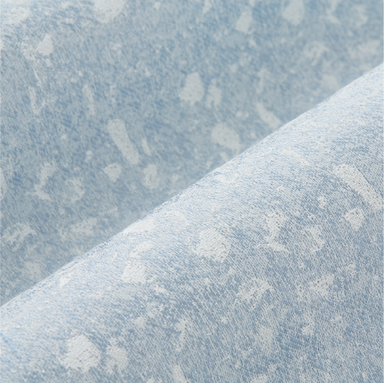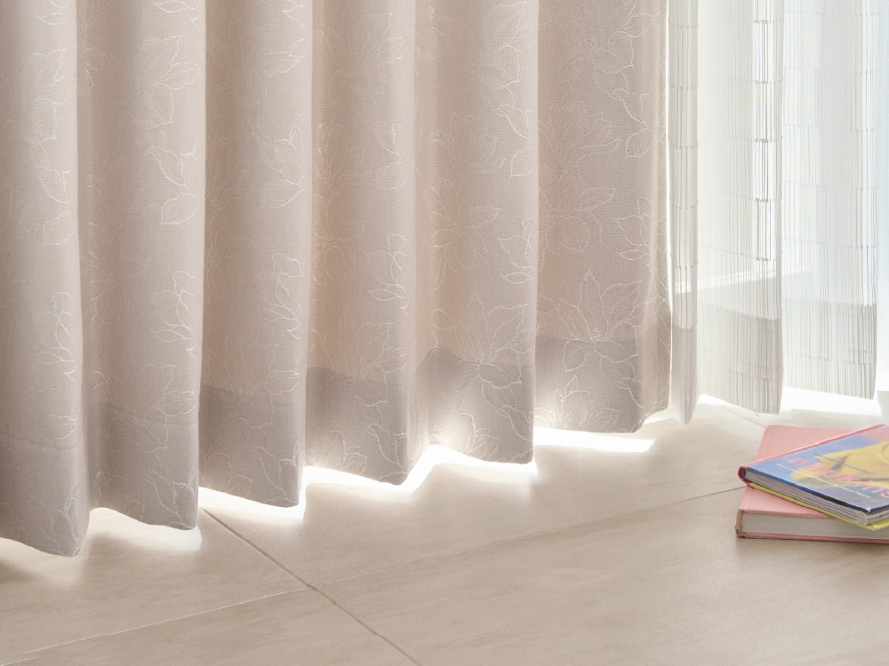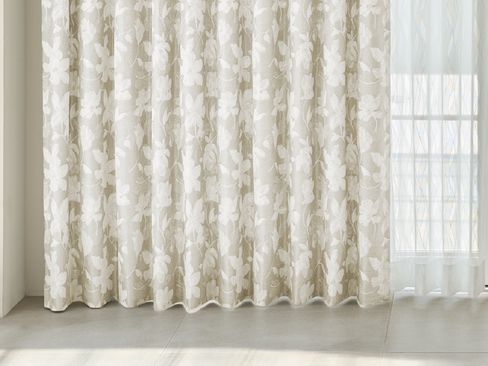 色付きのベースに、白い花柄が浮き上がるように織り込まれた、繊細で立体感のあるデザイン。光沢のある糸とマットな糸を組み合わせることで、見る角度によって表情が変わり、空間に豊かなニュアンスを与えます。花は糸の使い方にこだわり、奥行きを感じさせる仕上がりに。程良く遮光しながら、遮熱・防炎・ウォッシャブルと、機能面も充実しています。