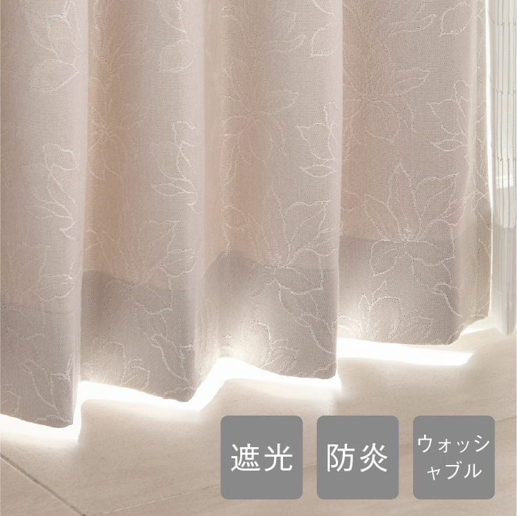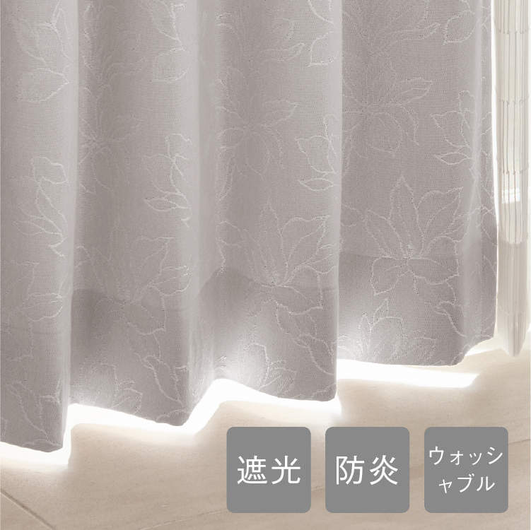 光沢+立体感のある白いラインで花柄を描いたような上品なジャカード織カーテン。光の当たり方や見る角度によって、花柄が見え隠れする表情を楽しめます。程よく光を遮りながら、断熱効果率57.2%の超遮熱性能で、室内の温度を快適にキープ。