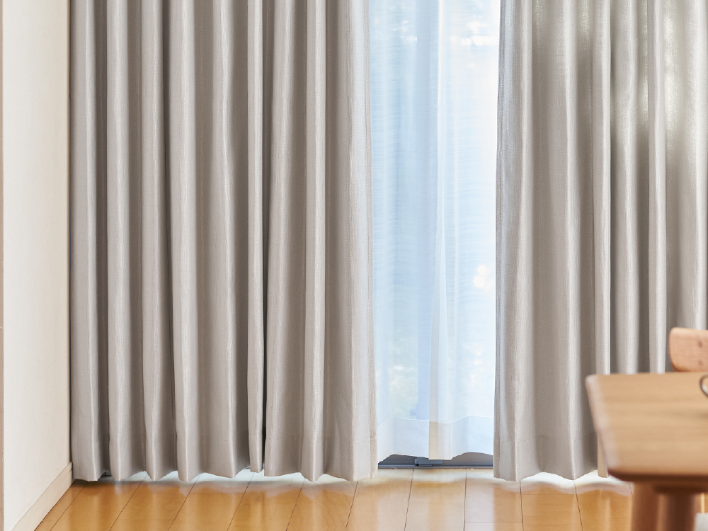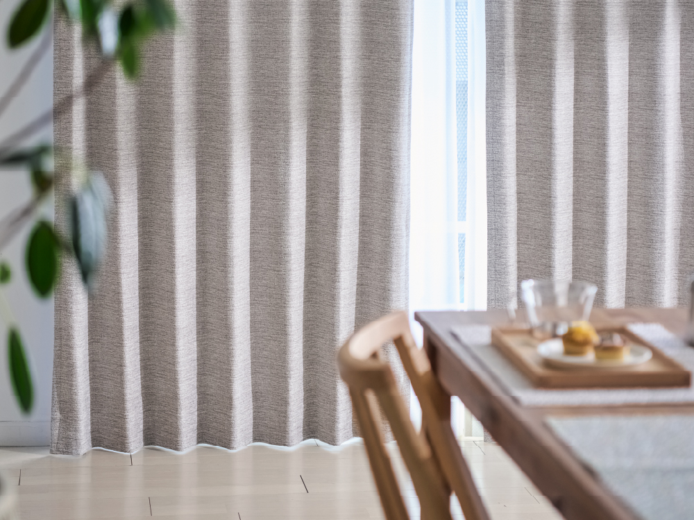程よい光沢・ランダムな糸の太さと色使い・凹凸感で、深みのあるドレープカーテン。糸の太さや微妙な色のミックス感があるのでシンプルでも単調になりすぎない上質な生地は北陸産地の高度な技術力の賜物です。
