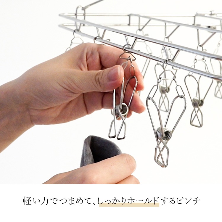 ピンチ同士の絡まりは洗濯の悩みの1つではないでしょうか。フレームにピンチを互い違いに配列し、ジョイント形状を工夫することでピンチ同士が絡まりにくい設計になっています。