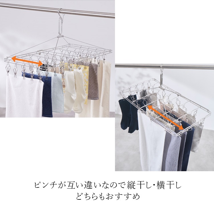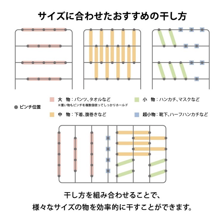 洗濯バサミの数は多いが、ひとつひとつの洗濯バサミと洗濯バサミの距離が近いので、ハンドタオルなどを干すときに無駄になってしまう洗濯バサミが多いです。靴下などを干すときには良いです。