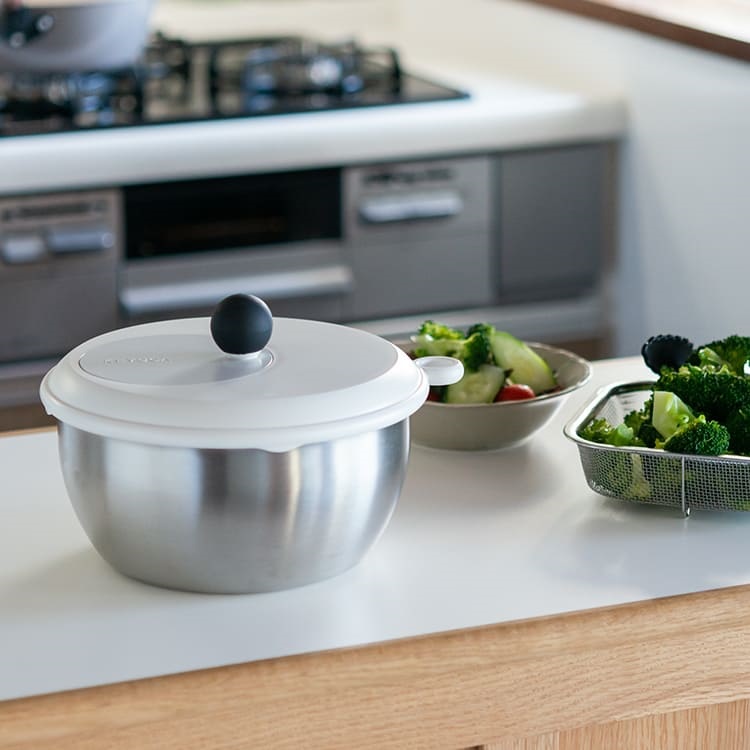 「サラダスピナー」以外にも、単体で「ザル」「ボウル」、「ザルとボウル」の組み合わせで、さらし水や水切りなどに、4通りの使い方ができます。 ボウルは、丈夫でサビに強い衛生的な18-8ステンレス製。 ザルとフタは、耐久性の高い衛生的な樹脂を使用しています。 安心安全な日本製で、末永くお使いいただけます。