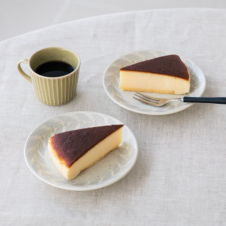 乳白色のまだら模様の釉薬で味わいある仕上がりになっています。洋風の柄を味わいある釉薬に仕上げたことで、和食器としても使いやすい風合いに。また、リーフ柄を淡い色味に仕上げて、落ち着いたテイストにしました。