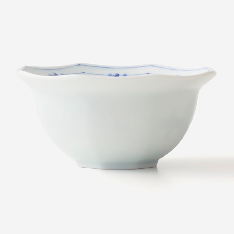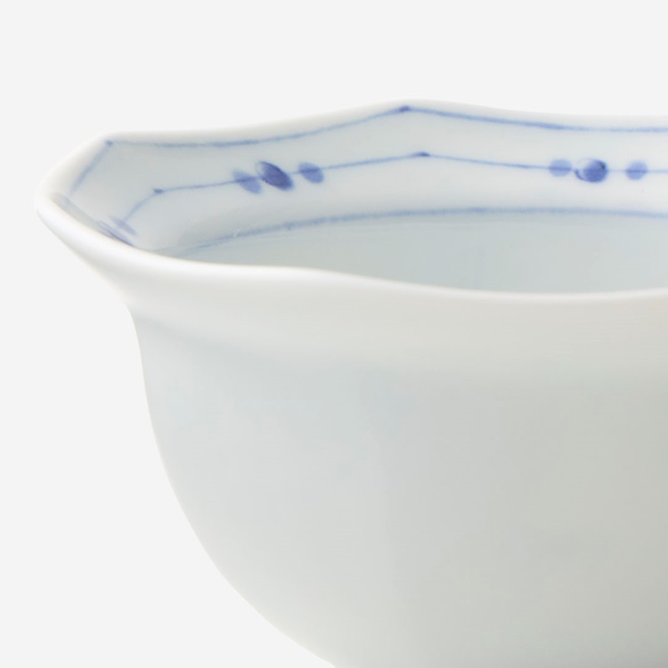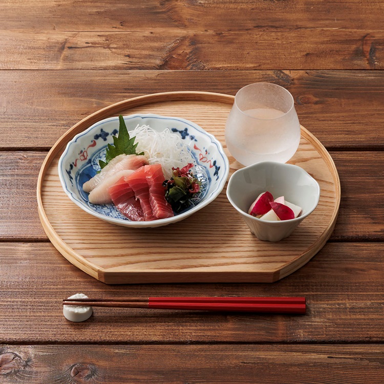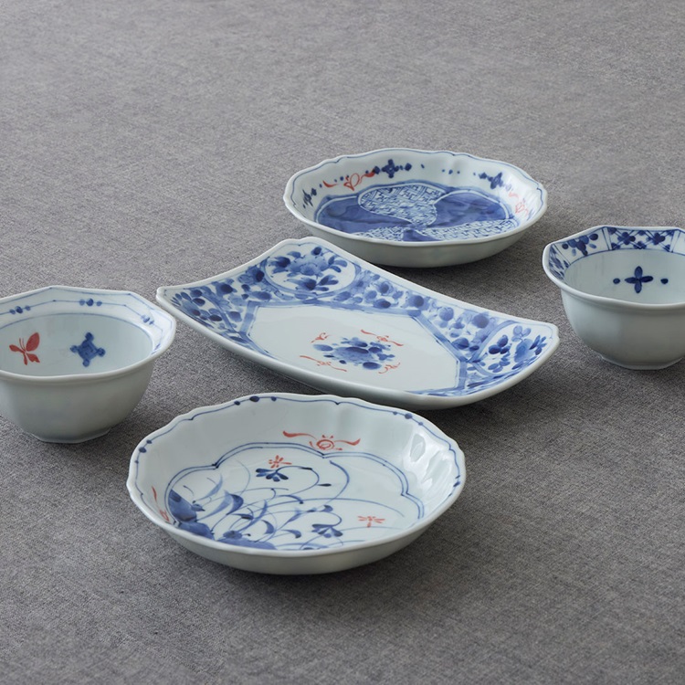 縁起のいい形状と、藍色と赤色の筆絵柄がポイント