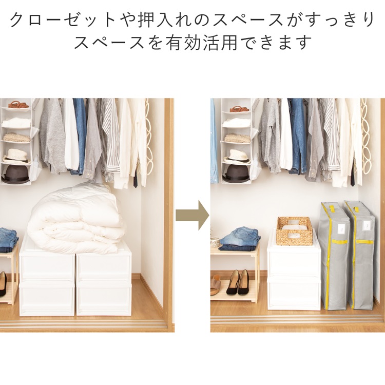 芯板でしっかり押さえることで、ボリュームのある羽毛ふとんもコンパクトに。クローゼットや押入れのスペースを有効活用できます。
