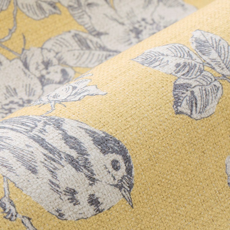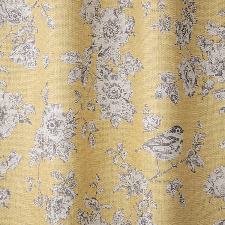 ざっくりとしたナチュラルな風合いの生地に、小鳥と草花が描かれたプリントドレープカーテン。