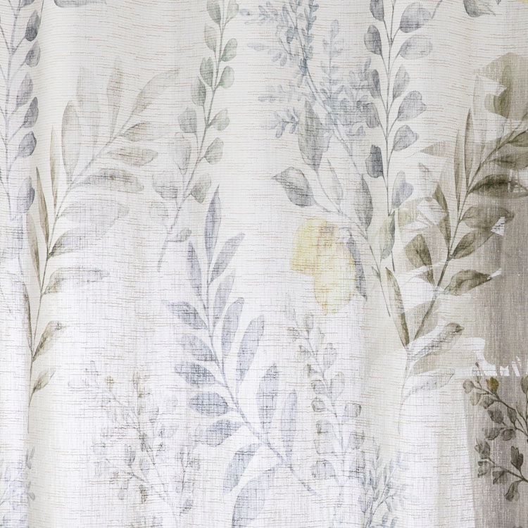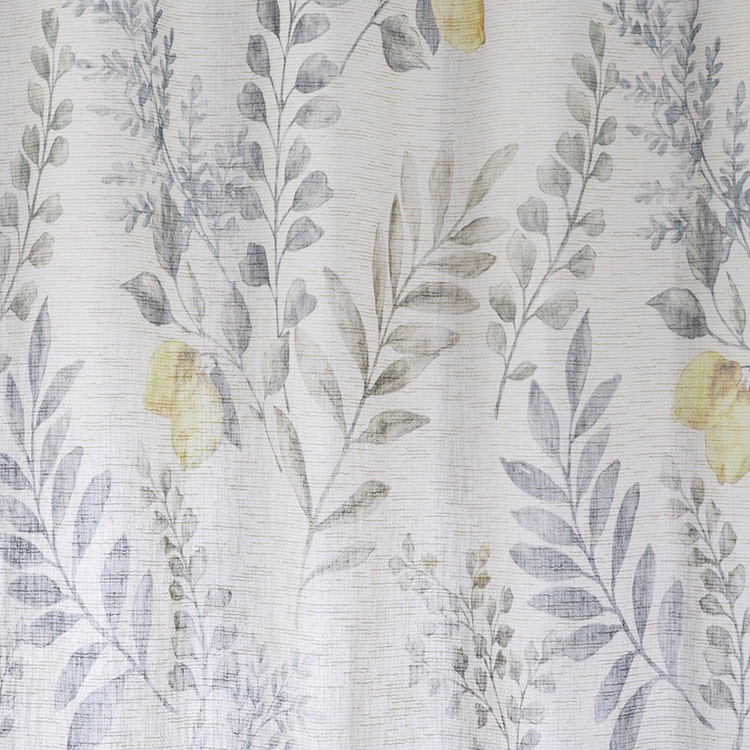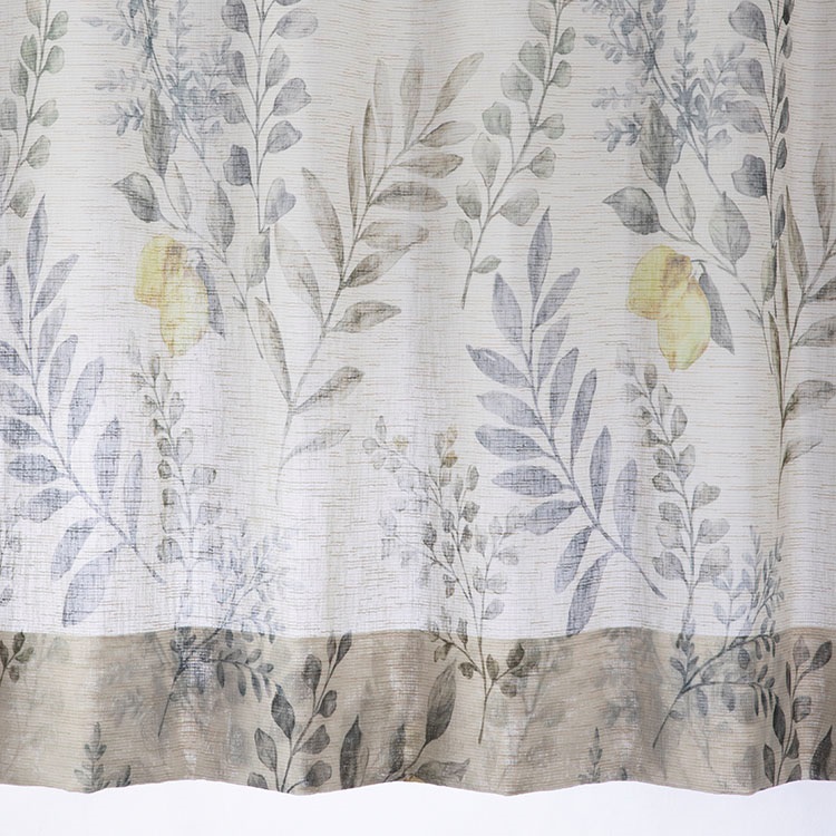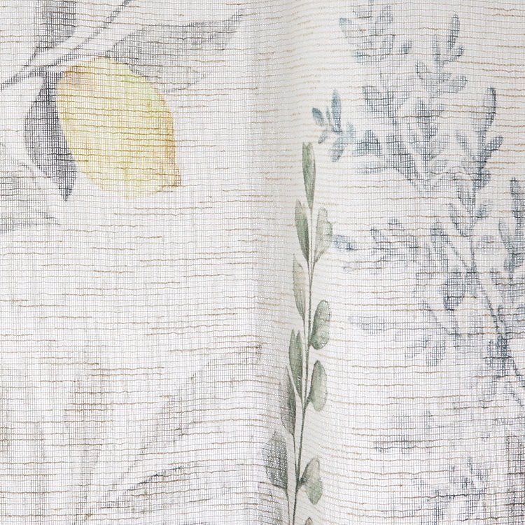 ざっくりとした麻調の生地に、ボタニカルなレモンの樹を描いた、プリントのレースカーテン。濃いめのグリーンやイエローの無地ドレープと相性抜群です。