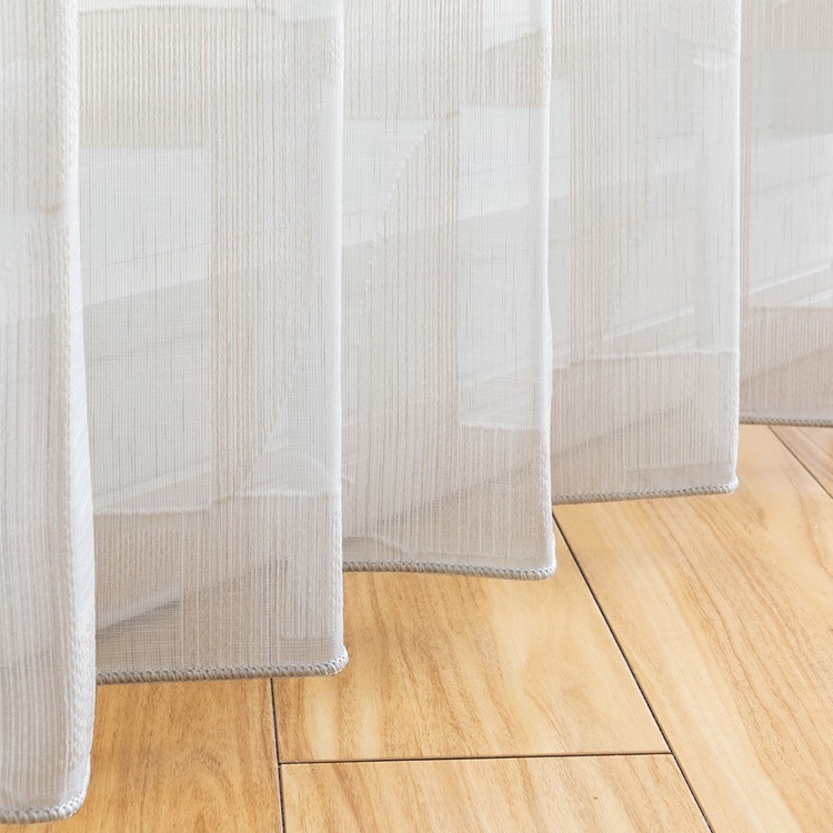 カーテンの裾の縫製仕様。ドレープカーテンは三つ折、レースカーテンは一部ウエイト巻きロックがございます。
