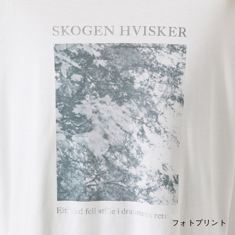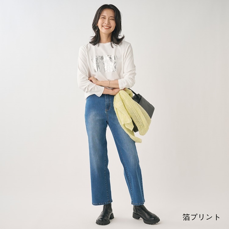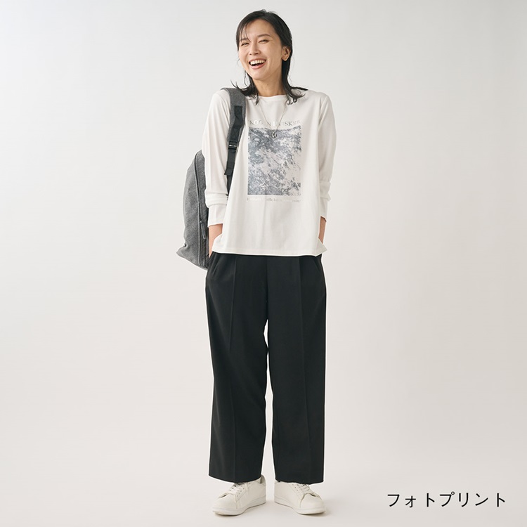 ニットトップスやアウターのインナーとして重宝する、大人にちょうど良いプリントTシャツ