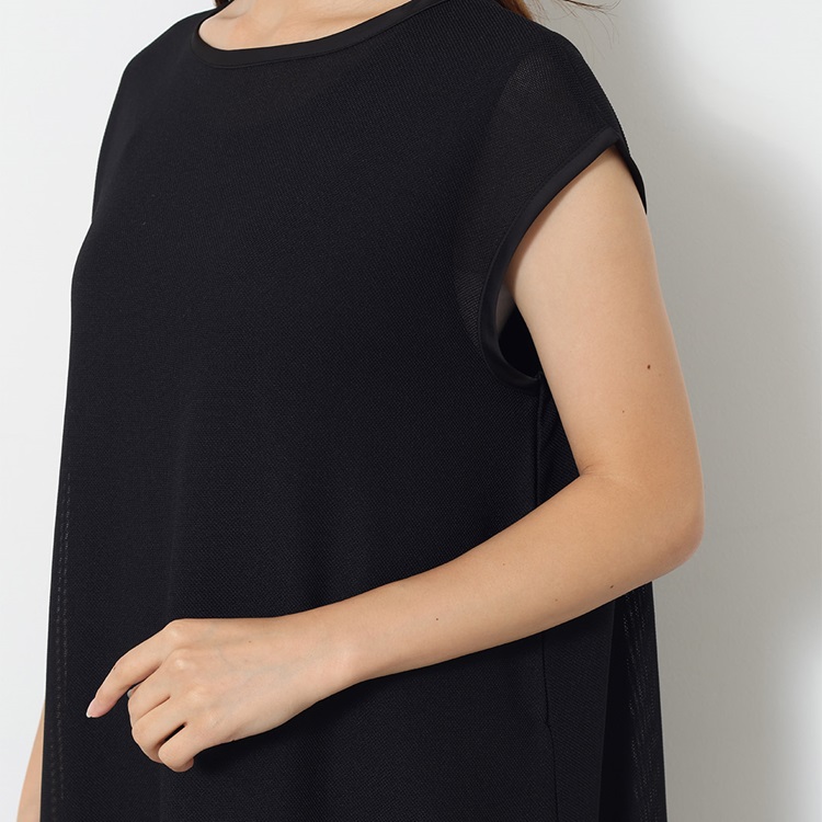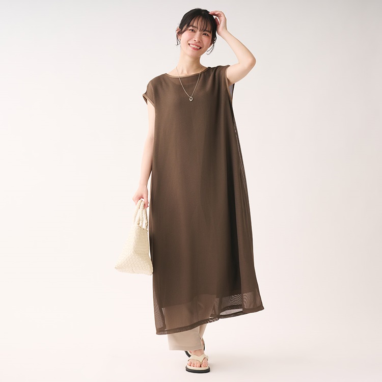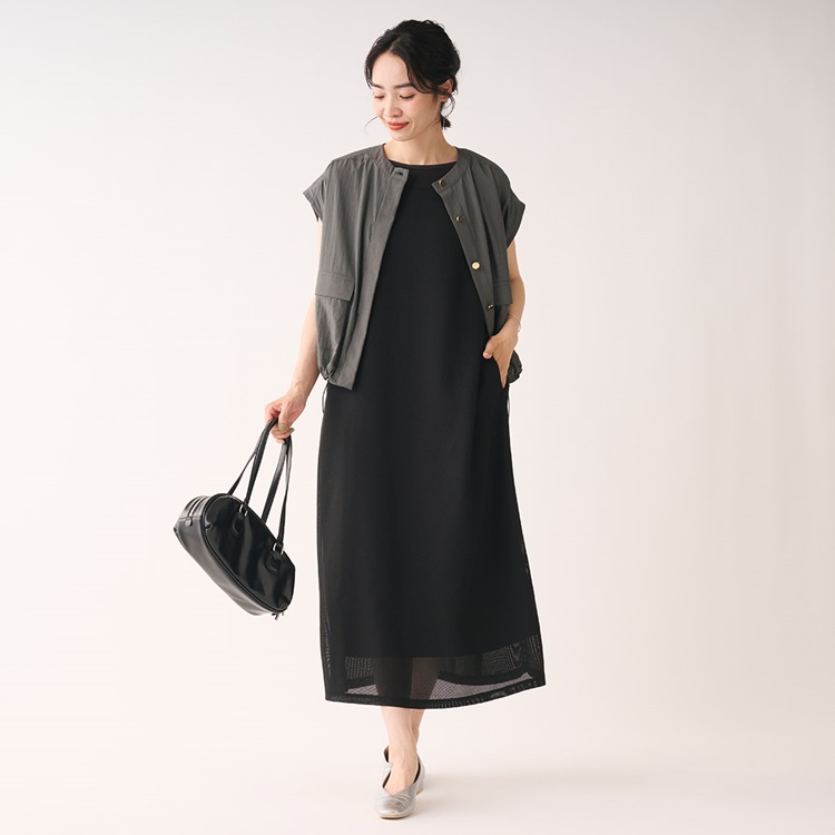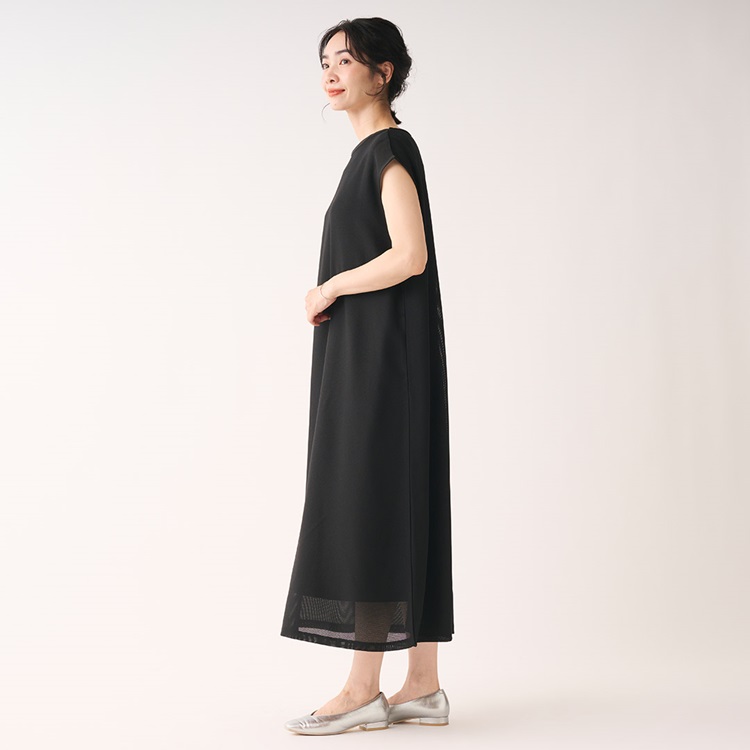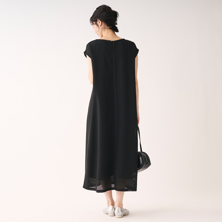 Aラインシルエットで上品見えする、大人が似合うメッシュワンピース