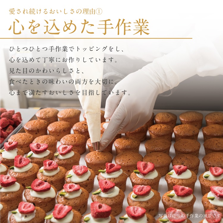 自家製の苺ソースをたっぷりと練りこんで風味豊かに焼き上げ、甘すぎないホワイトチョコのシャープさも魅力。甘酸っぱい苺と、キルシュの風味が上品な味わいです。