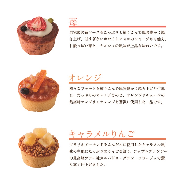 プラリネアーモンドをふんだんに使用したキャラメル風味の生地にたっぷりのりんごを飾り、アップルブランデーの最高峰ブラー社カルバドス・グラン・ソラージュで薫り高く仕上げました。