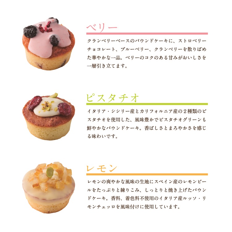 レモンの爽やかな風味の生地にスペイン産のレモンピールをたっぷりと練りこみ、しっとりと焼き上げたパウンドケーキ。香料、着色料不使用のイタリア産ルッソ・リモンチェッロを風味付けに使用しています。