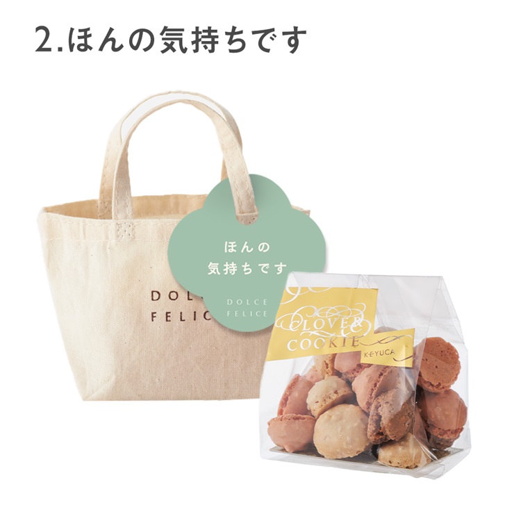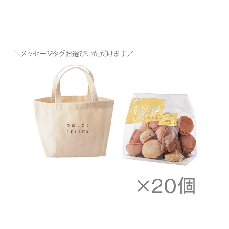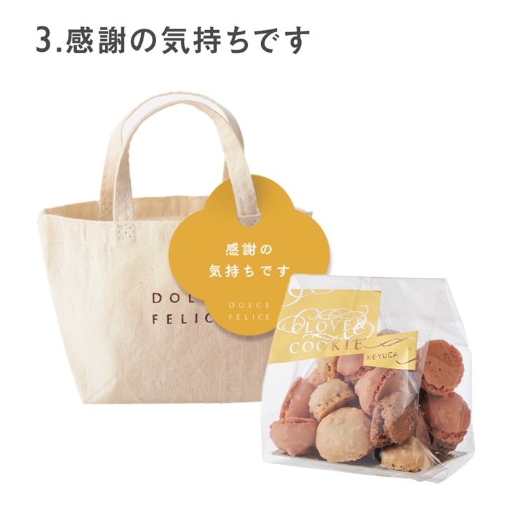 届きましたら、ご自宅でトートバッグにクッキーを詰めていただき、取手部分にメッセージタグを付けて完成です。