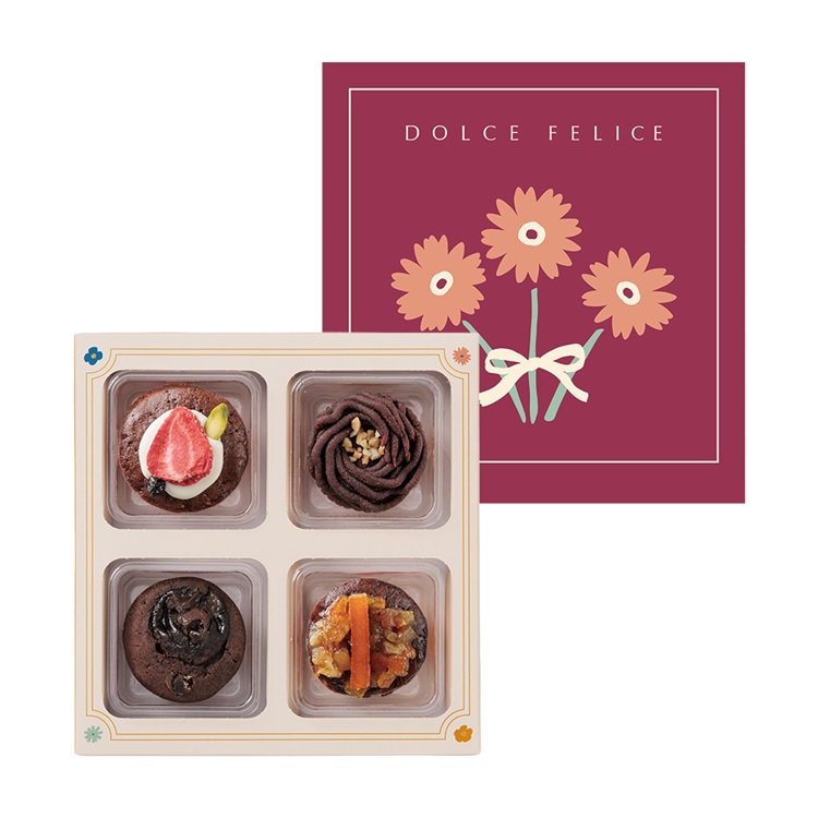 苺やオレンジの華やかなケーキから、濃厚ショコラまで、4つの味わいをひと箱に。