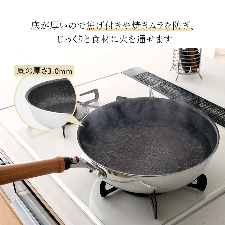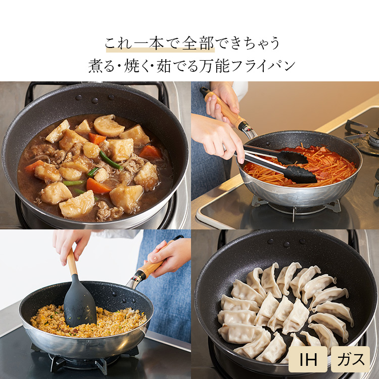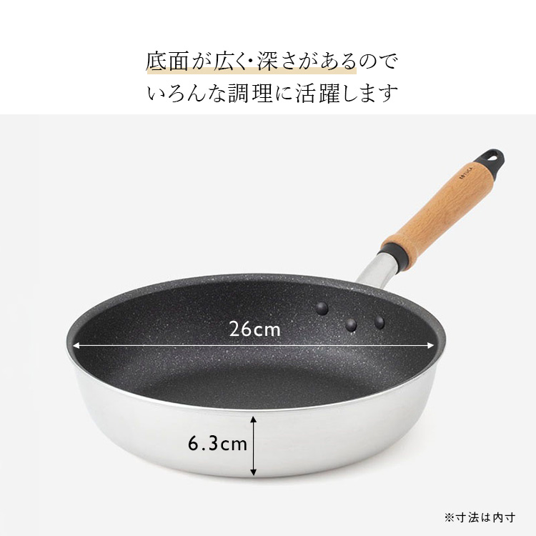 キッチンの収納場所がそれほど広くないので、色々な料理に使えるフライパンを半年ほどかけて探しました。最終的に購入したのがこちらのフライパンです。特に大きな決め手になったのは、底面の広さと適度な深さですが、重さ、耐久性、価格、デザインなども良いと思いました。重宝しています。ありがとうございます。