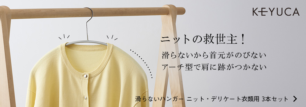 収納用品の通販・オンラインショップならKEYUCA(ケユカ)。ケユカでしか手に入らない、オリジナルのハンガーが揃います。お部屋が柔らかな印象になる木製ハンガーや、軽くて扱いやすいポリプロピレンのハンガー、特殊なコーティングを施した滑らないハンガーなど、豊富な種類を取り揃えているため、衣類に合わせてお選びいただけます。ケユカのハンガーは、使いやすさや形もこだわって設計しており、肩に跡を残さないラウンド型のニット用ハンガーや、ピンチ付きのハンガーはスカートやパンツに便利です。ワンアクションで固定できるクリップタイプもございます。伸縮バスタオルハンガーは、浴室乾燥や大判バスタオルにも対応します。機能性に溢れた、見た目もおしゃれなお気に入りのアイテムを、ぜひ見つけてみてください。