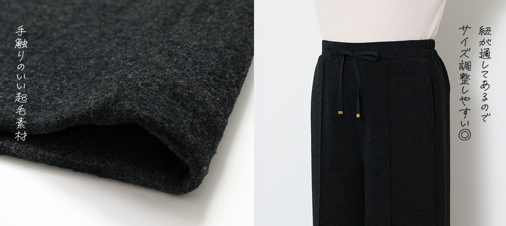毎年人気の冬質感の起毛ストレッチシリーズ。 ジャージーなので伸縮性もあり着心地が良く、ストレッチ性も抜群なのでストレスフリーな履き心地です。