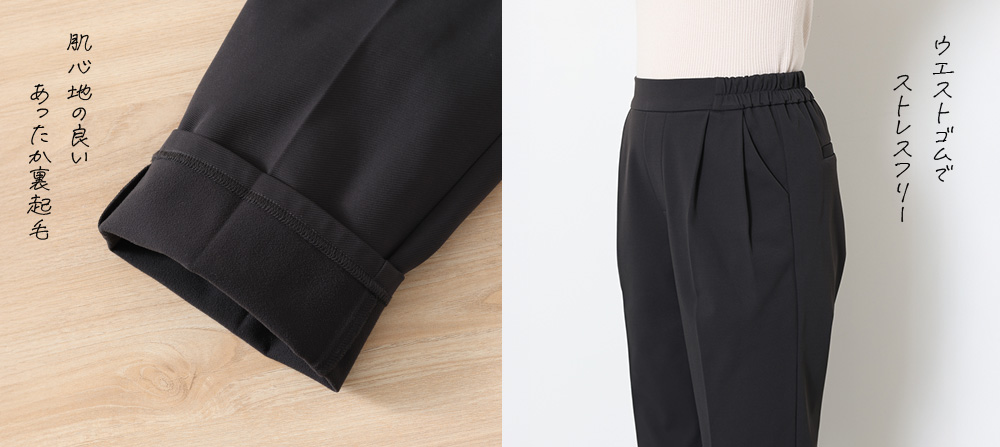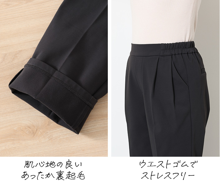 裏起毛のストレッチカットソータック入りできれい見えするテーパードパンツ