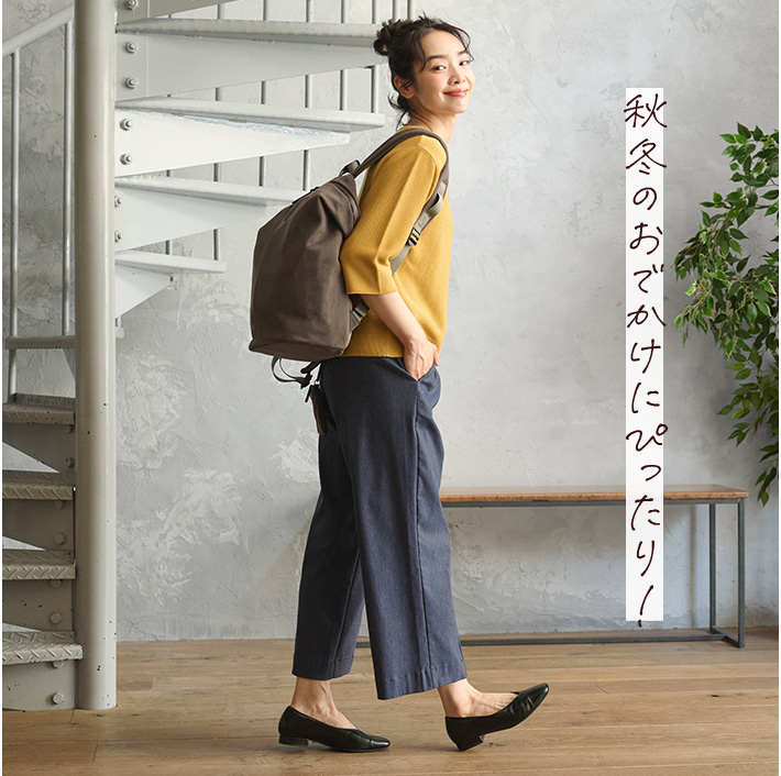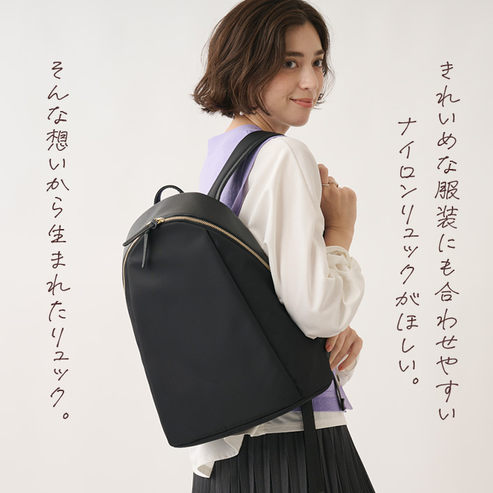 カジュアルになりがちなリュックスタイルが上品な印象に。