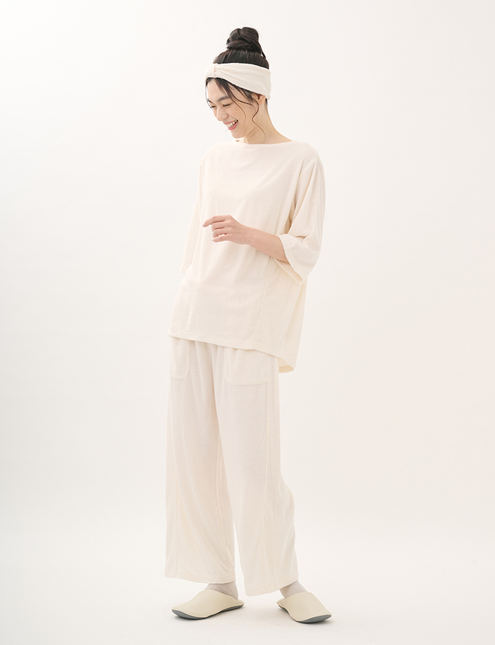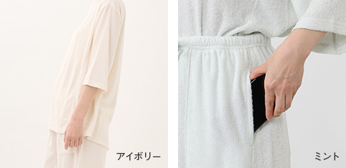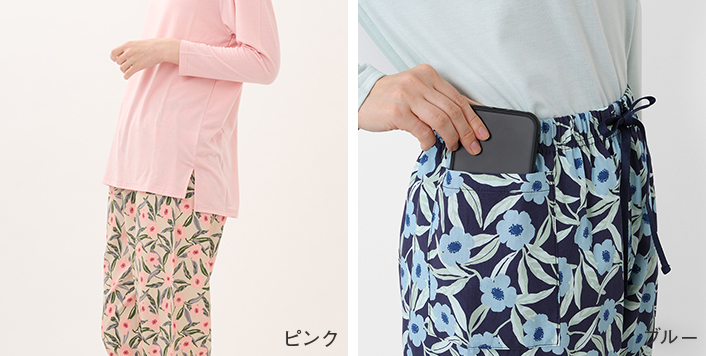 しめつけない、ゆとりのあるシルエット。トップスは動きやすく、家事の際も袖が邪魔になりにくい7分袖。パンツは携帯をさっと入れられる、ポケット付き。