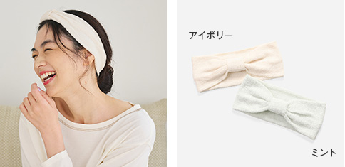 同素材のリボンモチーフがアクセントになったヘアターバン。ケユカのリラックスウェアと合わせたコーディネートがおすすめ、ギフトにもぴったり。