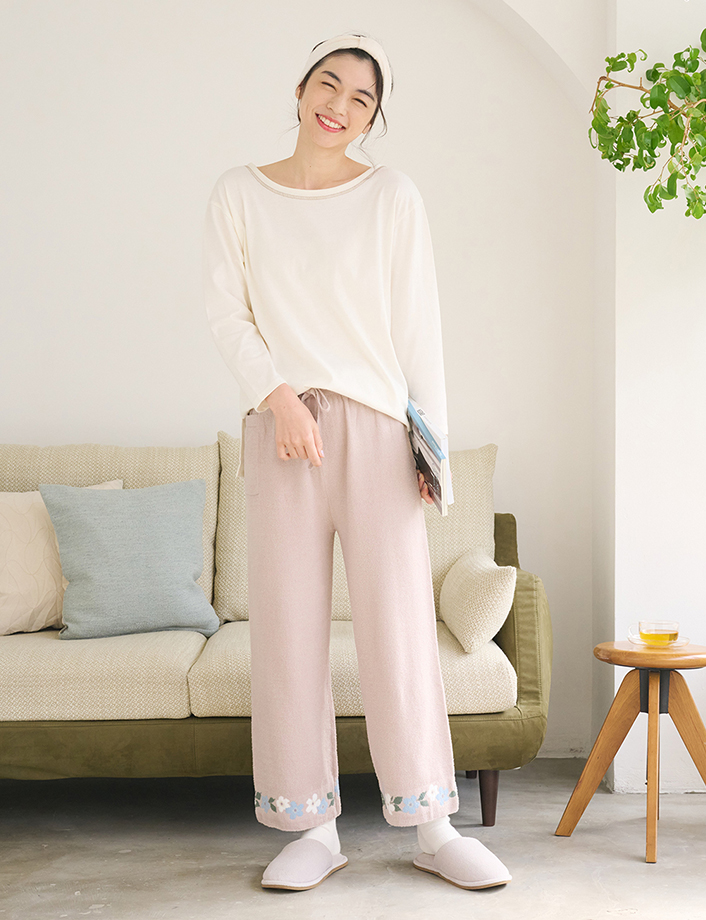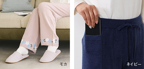 スマートなポケット付きのニットパンツは、伸びがよく動きがスムーズ。裾の花柄が、華やかさをプラス。