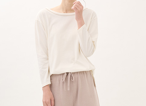 着心地のよいトップスは、パンツのカラーとリンクした襟の配色がさりげないアクセントに。