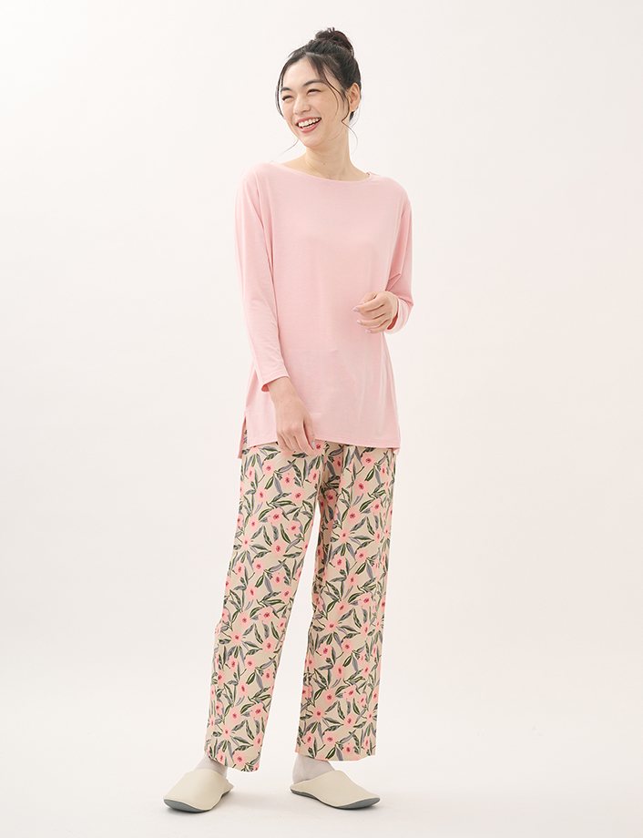 トップスは、やわらかくなめらかな肌触りのカットソー素材。パンツ脇は、シームレス設計で、寝返りもスムーズに。デザインを邪魔しないポケット付き。