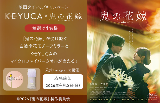 映画『鬼の花嫁』が2026年3月27日(金)に公開! 公開を記念して、「鬼の花嫁」が受け継ぐ白彼岸花モチーフミラーとKEYUCAのマイクロファイバータオルが抽選で当たるキャンペーンを実施します。 下記応募要項・注意事項をよくお読みの上、ぜひご応募ください。 【キャンペーン応募要項】 ◆応募期間 2026年3月23日(月)~4月5日(日) ◆賞品 ・「鬼の花嫁」が受け継ぐ白彼岸花モチーフミラー 1点 ・抗菌防臭フェイスタオル GreetingBouquetマイクロファイバー 34×80cm スミレパープル色 1点 上記のセットを抽選1名様にプレゼント ◆応募方法 1. KEYUCA公式Instagram「@keyuca_design」 をフォローする 2. 映画『鬼の花嫁』公式Instagram「@onihanamovie」 をフォローする 3. KEYUCA公式Instagramのキャンペーン投稿をいいね 【さらにストーリーズでシェアすると当選確率アップ!】 KEYUCA公式Instagramはこちら ≫ 映画『鬼の花嫁』公式Instagramはこちら ≫ ◆応募条件 以下全ての条件を満たしている方 ・ご応募されるInstagramアカウントを公開設定にしている方 ・上記の応募方法に沿ってご応募いただいている方 ※ご当選は抽選時にKEYUCAおよび映画『鬼の花嫁』公式Instagramのフォロワー様に限ります ◆当選発表 ・ご当選者様にはご応募いただいたInstagramアカウントに「@keyuca_design」よりDMでご連絡いたします。 ※不審なアカウントからのフォローやDM(ダイレクトメッセージ)が届いた場合は、URL(アドレス)にはアクセスせず、アカウントのブロックをお願いいたします。 ・賞品の発送は4月下旬予定です。 ◆注意事項 ・発送は日本国内のみとなります。海外への発送はできかねます。 ・当選通知後、指定の期日内にDMのご返信をいただけなかった場合は無効とさせていただきます。何卒ご了承ください。 ・賞品受取権利を譲渡することはできません。 ・以下の方は、応募および賞品受取権利が無効となりますのでご注意ください。 ご応募いただいたSNSアカウントを削除またはユーザーネームを変更された場合 非公開アカウントの場合 DMの受信を拒否する設定をされている場合 Instagramの利用規約に反する不正なアカウントである場合(架空アカウント、他人のなりすましアカウントなど) ・複数回ご応募いただいた場合も、当選はお1人様につき1回限りとなります。 ・賞品のお受け取りが出来ず、弊社宛に返送された場合、当選は無効となります。再発送は行いません。 ・当社の社員および関係者は応募できません。 ・選考方法、応募受付の確認、当選・落選についてのお問い合わせにはお答えしかねます。 ・応募の際のインターネット接続料および通信費はご自身のご負担となります。 ・本キャンペーンへ応募が完了した時点で、この応募要項および注意事項に同意したものとみなします。 ・本キャンペーンへの参加は、応募者自らの判断と責任において行うものとし、応募に際して応募者に何らかの損害が生じた場合、当社の故意または重過失に起因するものを除きその責任を一切負いません。 ・キャンペーンの仕様は予告なく変更する場合があります。 ・本キャンペーンは、Meta社が支援、承認、運営、関与するものではありません。 【映画『鬼の花嫁』】 ■ストーリー あやかしと人間が共存する世界。 優れた容姿と能力で人々を魅了するあやかしたちは、時に人間の中から花嫁を選ぶ。 あやかしにとって花嫁の存在は唯一無二。一度見初めたら、生涯その花嫁だけに愛を捧げる。 特にあやかしの中でも最も強く美しい “鬼”の花嫁に選ばれることは、最高の名誉と言えた。 妖狐の花嫁である妹と比較され、家族から愛されず虐げられてきた柚子(吉川 愛)が出会ったのは、あやかしの頂点に立つ“鬼”だった。 「見つけた、俺の花嫁 ――」 鬼の一族の次期当主・玲夜(永瀬 廉)に花嫁として見出された柚子。 突然の事態に戸惑いながらも、徐々に玲夜の不器用だけど優しいところや誠実な姿に惹かれていき、玲夜もまた、生まれながらに一族の行末を背負い、一人抱えてきた重責と孤独が柚子によって癒されていく。 互いに居場所を見つけ、愛を確信していく2人。 しかし、柚子が“鬼の花嫁”になったことを面白く思わない妹の花梨(片岡 凜)が、 婚約者の妖狐・瑶太(伊藤健太郎)と一緒に2人を引き離そうと画策する。 柚子は玲夜の花嫁として自分がふさわしいのか、そして玲夜は柚子が急激にあやかしの世界に巻き込まれてしまうことが本当に幸せなのか、不安を覚える。 そんな中、玲夜の花嫁として柚子がお披露目となる舞踏会に瑶太と花梨が現れ… 果たして運命に導かれた2人は、真実の愛を掴むことができるのか ―― ■クレジット&ビリング 永瀬 廉 吉川 愛 伊藤健太郎 片岡 凜 兵頭功海 白本彩奈 田辺桃子 谷原七音 尾美としのり 眞島秀和 陽月 華 橋本 淳 嶋田久作 尾野真千子 原作:クレハ「鬼の花嫁」(スターツ出版文庫) コミカライズ:作画・富樫じゅん/原作・クレハ(スターツ出版「noicomi」) 監督:池田千尋 脚本:濱田真和 音楽:小山絵里奈 主題歌:「Waltz for Lily