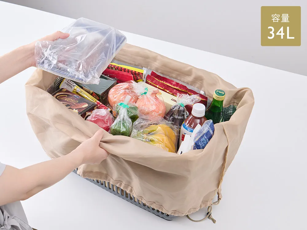 スーパーのレジカゴ1個分がまるごと入る大容量。カゴと同じくらいマチが広く、食品のまとめ買いやパックのお肉、お惣菜など平らに入れたい食材の買い物にも便利です。口部分は巾着仕様で大きく開くので物の出し入れがしやすく、たくさん物を詰めてもしっかり目隠しできて安心仕様。