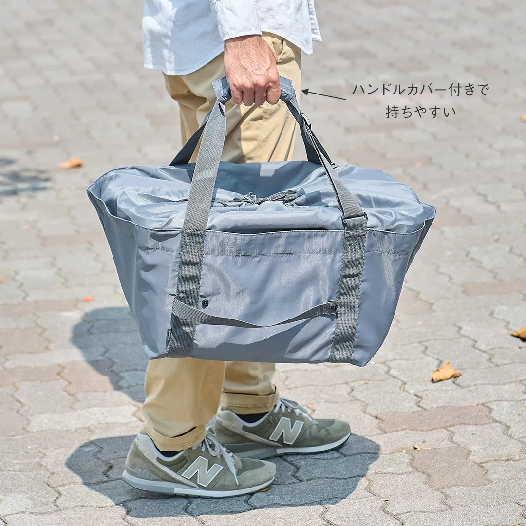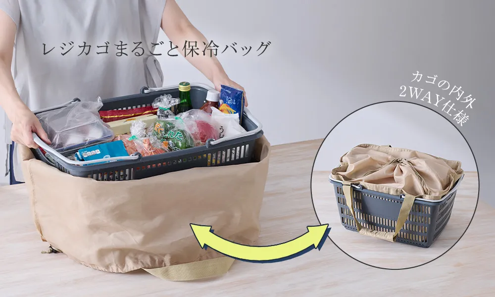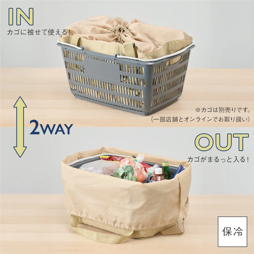 レジカゴの内外どちらも対応OK。袋詰めする際に、レジカゴの内側にセットして詰めたり、レジで精算するときにカゴにセットすれば、買い物の時短にも。また、マイカゴをお持ちの方は、カゴごとすっぽり入れて保冷しながら持ち運ぶことができます。