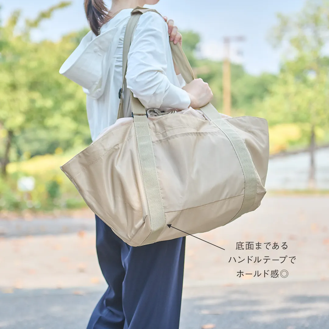 ハンドルは、肩にかけたり手に持ったり、荷物の量や持ち方に合わせて調整できます。ハンドルをまとめるパーツ付きなので、肩からずれ落ちてしまったり、重みで肩や手が痛くなる、買い物中のストレスも解消できます。ハンドルのテープを底面までまわすことでホールド感もあり、耐荷重もなんと15kgまでOK!