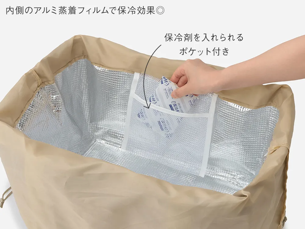内側はアルミ蒸着フィルムを使用しているので、冷蔵品や冷凍食品も安心。保冷剤を入れるメッシュのポケットも活用すれば、暑い時期の買い物で不安に思ったり、急いで帰らなきゃと焦る気持ちも軽減してくれます。