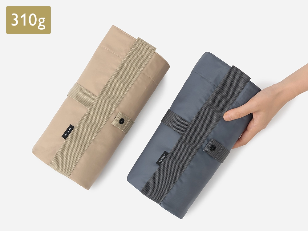 バッグ本体の外生地は、ほどよい張りのある生地を使用しているので折りたたみやすく、付属のベルトをまわしてボタンをとめるだけで、コンパクトにまとまります。軽さは310g。(りんご約1.5個分の重さです。)