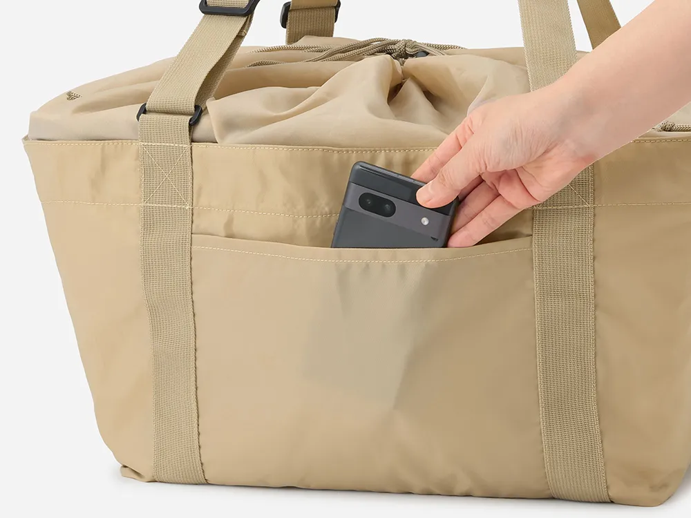外ポケットがついているので、スマホやお財布、買い物メモやレシートなど、ちょっとした小物を一時的に収納するのに便利です。