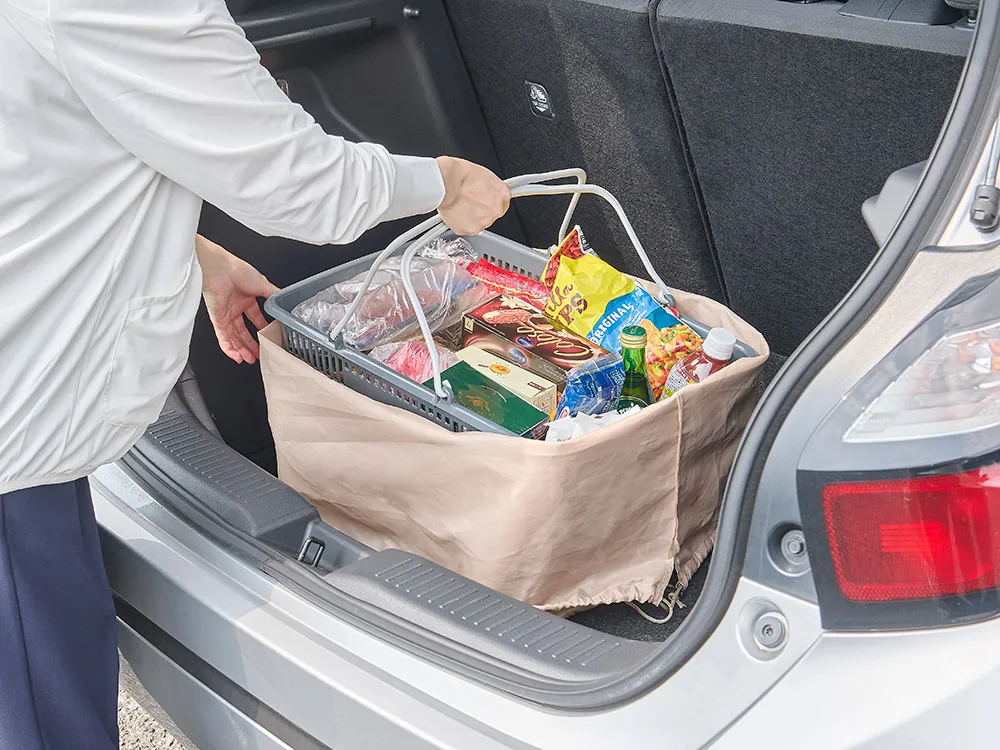 車のトランクにマイカゴと保冷バッグを積んでおけば、いつでも買い出しで使えて、家の中で場所を取る心配もありません。カゴに入れることで、車の揺れによる荷崩れを防止することができます。
