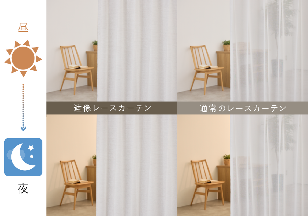 日中、外から室内を見えにくくします。プライバシーを守りながら、程良い光を取り込みます。夜間は効果が弱まるため、ドレープカーテンを閉めていただく使い方がおすすめです。 基本的には遮像レースカーテンよりも光を取り込みやすくなっています。