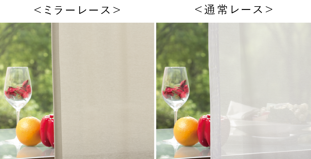 外からの視線を自然に遮り、プライバシーをしっかり確保。安心できる暮らしを叶えます。1階に住んでいる方や、人通りが多い道や隣家に面した窓におすすめです。 基本的にはミラーレースカーテンよりも光を遮りやすくなっています。
