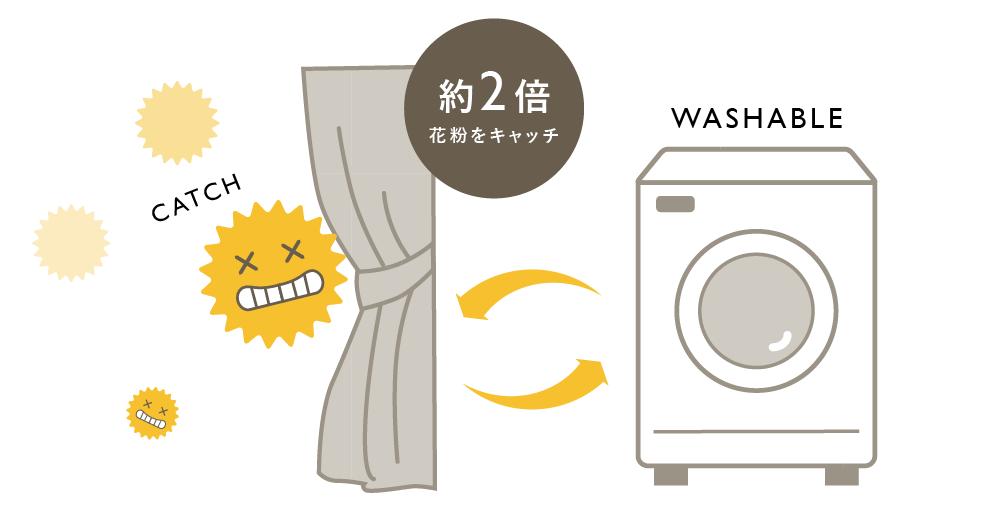 花粉をつかまえやすい加工または糸を使用しているカーテンです。 一般的なレースカーテンに比べ約2倍の花粉キャッチ率で、外から室内への花粉の侵入を抑えます。キャッチすると言ってもベタベタしているわけではなく、普通のレースカーテンと同様のさらっとした触り心地です。 キャッチした花粉は、洗濯することでキレイに除去できます。ケユカの花粉キャッチカーテンはすべてご家庭の洗濯機で簡単に洗っていただけます。 また、一般的なレースカーテンに比べほこりやハウスダストもキャッチしやすいため、ハウスダストアレルギーの方や、お部屋を清潔に保ちたい方にもおすすめです。