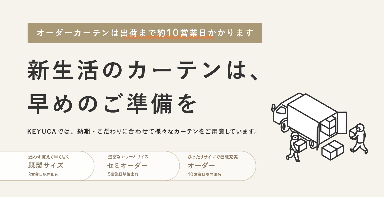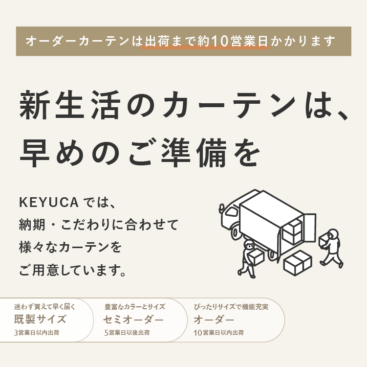 オーダーカーテンはお届けまでに日数がかかる場合があり、春の新生活シーズンは注文が集中しやすくなります。