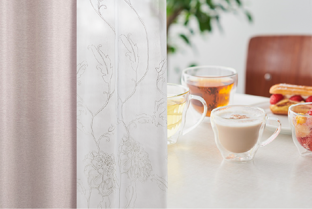 とてもシンプルで、ブラウスのようなとろみ感と柔らかさがあります。 遮熱に加え、UVカット、防炎とうれしい機能がたくさん!透過性も低いため、 外から中も見えにくいので安心してお使いできます。