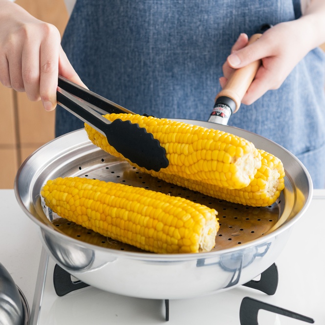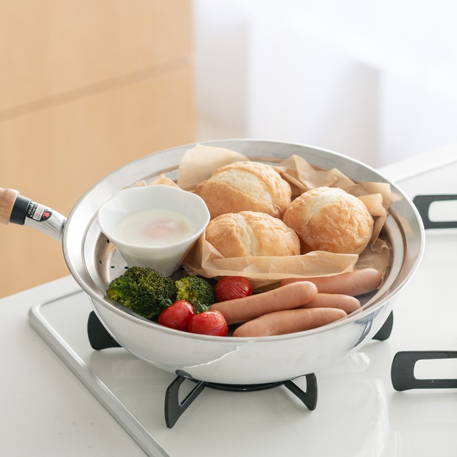 ・手持ちのフライパンや鍋にのせるだけ! ・浅型ざるで食材が取り出しやすく、使いやすさ抜群 ・ドーム型のふたで、食材を一度にたっぷり蒸せる ・ガラス窓のついたふたで、蒸し具合を簡単に確認できる ・ステンレス製で、お手入れが簡単で衛生的!