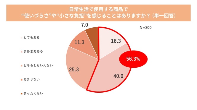 日常生活の中で“困りごと”や“小さな負担”を感じることはあるのか調査を実施したところ、68.3%の方が『感じている』と回答(図1参照)。不便さを感じるシーンとしては、『片付け』が48.3%と特に多く、次いで『調理(46.7%)』『収納(46.0%)』という結果になりました。 家の中で毎日繰り返すシーンで“困りごと”や“小さな負担”を感じている人が多いことから、暮らしの基盤となる領域にこそ、多くの“使いづらさ”や“不便さ”が潜んでいることが明らかとなりました。 さらに、生活グッズに対し“使いづらさ”や“小さな負担”を感じる瞬間が『とてもある』『まあまあある』と回答した方が全体の半数を超え(図2参照)、多くの生活グッズが日常的に不便さを感じさせていることもわかりました。この結果から、日々の小さなストレスが積み重なり、暮らし全体の満足度に大きな影響を与える可能性があることが考えられます。