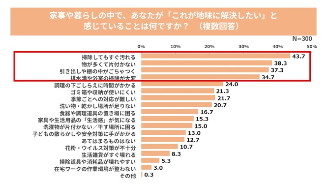 暮らしの中に潜む“解決をしたい地味な負担”については、『掃除をしてもすぐ汚れる(43.7%)』『ものが多くて片付かない(38.3%)』『引き出しや棚の中がごちゃつく(37.3%)』『排水口や浴室の掃除が大変(34.7%)』といった、日常的な悩みが挙げられました(図3参照)。 これらの不便は一見すると軽視されがちですが、毎日の生活の中で頻繁に繰り返されることから、長期的には大きなストレスとなり、生活の質に影響を与えていることがわかります。このことから、“地味な負担”を解消することが、日常生活のクオリティ向上において非常に重要であると考えられます。