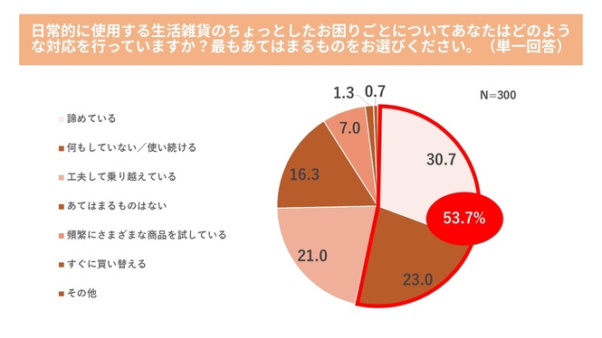 ・日常生活にお困りごとを感じている人は全体の約7割! 収納や調理、掃除など毎日発生する生活シーンに不便さを感じている人が多い傾向。 ・物が多い、引き出しの中がごちゃつくなど、暮らしの中には地味な負担も… ・不便を認識しながらも“我慢している人”が半数越え! “小さな困りごと”は多くの人にとって未解決であることが明らかに。 ・商品を選ぶ際に重視するポイントは、66.7%が『機能性』と回答。次いで価格、耐久性という結果。 安さよりも長期的な満足感を重視する時代へ。 ・日傘に対してはUVカット機能や晴雨兼用の実用性だけでなく、軽量性等の利便性が強く求められる結果に。 ・異常気象や環境問題を背景に、“ここ5年で課題を解決するための買い物”をしたことがある人は半数以上。