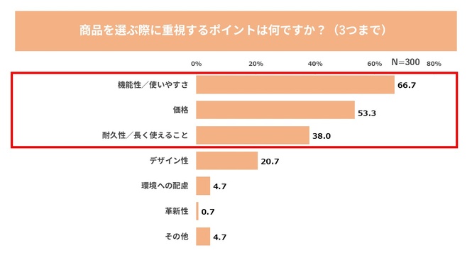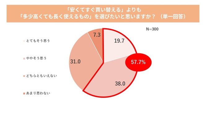 実際に商品を選ぶ際に重視するポイントとしては、『機能性/使いやすさ(66.7%) 』、『価格(66.7%) 』、そして『耐久性/長く使えること(38.0%)』が上位に挙げられました(図6参照)。これらの結果から、安さや手軽さだけでなく、“長期的に満足できること”を重視する傾向が強いことが明らかになりました。 また、「安くてすぐ買い替えるものよりも、多少高くても長く使えるものを選びたいか」という問いに対して、57.7%の人が『そう思う』と回答(図7参照)。これにより、生活者の間では確実に、安さや便利さから、長く使える価値へのシフトしていることがわかりました。