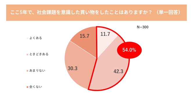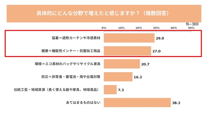 さらに見逃せないのが、社会の変化です。異常気象や環境問題などを背景に「ここ5年で、社会課題を意識した買い物をしたことがあるか」という問いには、54.0%の人が『ある』と回答(図8参照)。 具体的な購入品としては、『猛暑対策としての遮熱カーテンや冷感素材(29.0%)』『機能性インナー・抗菌加工用品(27.0%)』『エコ素材のバッグやリサイクル家具(20.7%)』などが挙げられました。また、「以前に比べてこうした買い物は増えましたか?」という質問には、半数以上が『増えた』と回答しています。