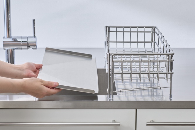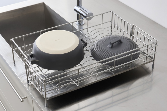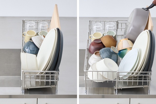 大容量の時には、土鍋やフライパンなどの大きくて重たい食器も安心して置けます。 洗い物が多い日でも、まとめてしっかり乾かせるので毎日の後片付けがスムーズになります。