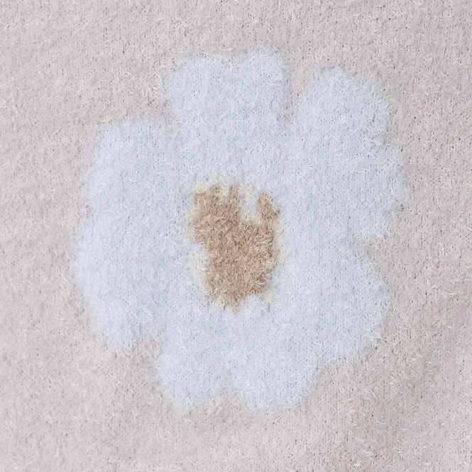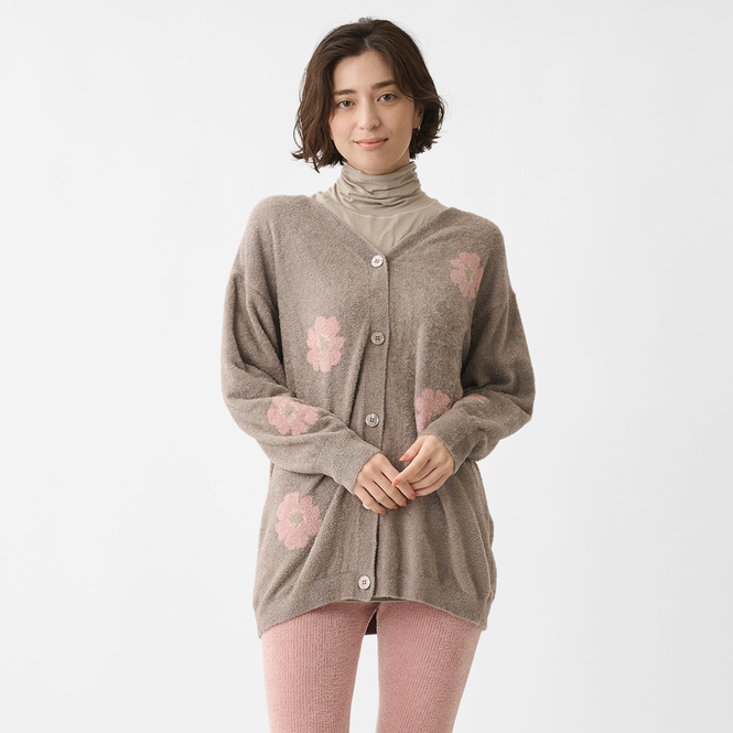 ■ケユカリラックスウェア チクチクしにくい前後2WAYフラワーカーディガン 着用した瞬間に感じる贅沢な滑らかさとふわっとした毛足が特徴の糸を使用した、チクチク感なく素肌に気持ちいいカーディガンです。カーディガンとしてはもちろん、プルオーバーとしても前後どちらも着用可能。品のあるお花デザインで気分も上がります。